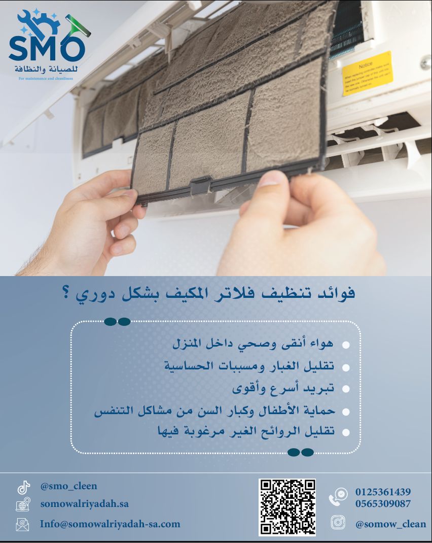 فوائد تنظيف فلاتر المكيف بشكل دوري هواء انقى وصحي داخل المنزل تقليل الغبار ومسببات الحساسية تبريد اسرع واقوى حماية الأطفال وكبار السن من مشاكل التنفس تقليل الروائح غير المرغوب فيها التواصل : 0565309087